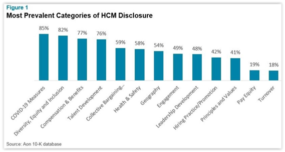 - Prevalence - The most commonly disclosed topics (disclosed by more than half of filers) across the 13 categories of disclosure topics Aon identified were COVID-19 health measures, DE&I, compensation & benefits, talent development, collective bargaining, health & safety, and geography.
