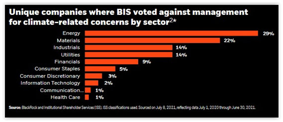 - In the Americas region, BlackRock voted against 172 directors (including abstentions), and 177 companies (including votes against or abstain on director elections and director-related proposals and votes in support or abstain on climate-related shareholder proposals), for climate-related concerns. Globally, votes against management for climate-related concerns were most common among Energy sector companies, as shown here:
