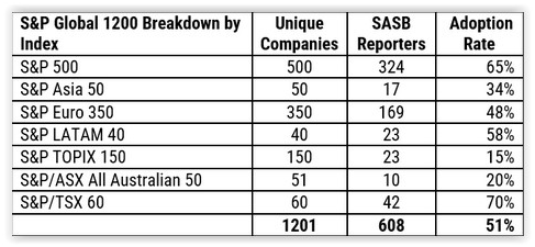 The Value Reporting Foundation reported that over half of the S&P Global 1200 use the SASB Standards in their investor communications. Here is the breakdown by index: