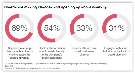 See these articles: “More Corporate Directors Welcome Rules to Boost Board Diversity” (Bloomberg) and “Corporate directors see ESG reporting as necessity” (Accounting Today), “PwC Survey: Boards Increasingly Linking ESG to Strategy, But Don’t Fully Grasp Risks” (ESG Today), and “Boards facing regulatory scrutiny intensify focus on ESG” (CFO Dive), and additional resources on our Board Practices/Governance Practices page.