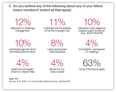 - Peer perceptions - Although 47% of respondents overall said that, in their opinion, at least one of their fellow directors should be replaced (compared to 49% last year), respondents' bases for criticism of fellow directors are extremely noteworthy for what they do NOT include: