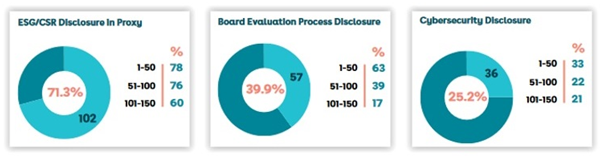 - Notably, with respect to nearly all disclosures benchmarked, a significantly higher percentage of the largest 50 companies (of 150 companies total) provided disclosure as compared to the smallest 50 companies, with the middle 50 falling somewhere in between, as illustrated here:
