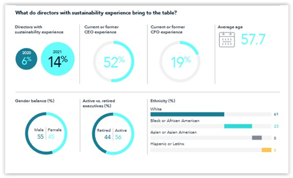 - Less ethnically diverse - New directors with sustainability experience are less ethnically diverse than the new director class as a whole (61% white vs. 59% white for the new director class as a whole).