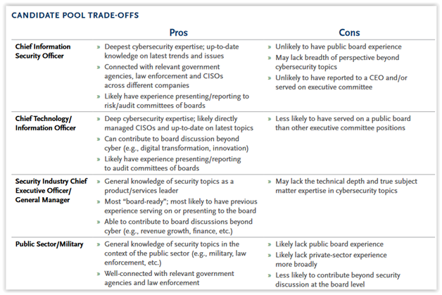 For those boards seeking to add a director with cyber or tech expertise, “Cybersecurity and the Board” from Spencer Stuart identifies critical qualifications to seek in prospective directors and the potential or likely upsides/downsides associated with different candidate backgrounds commonly explored for this role.