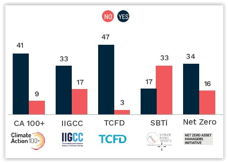 - Climate-specific initiatives—This bar graph shows how many of the 50 largest asset managers support each of the referenced climate-related initiatives:
