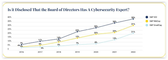 • 39%, 31%, and 21% of S&P 500, S&P MidCap, and S&P SmallCap companies, respectively, disclosed in their 2022 proxies whether the board has a cyber expert - up from 34%, 22%, and 13%, respectively, in 2021, and 7%, 4%, and 3%, respectively, in 2016.