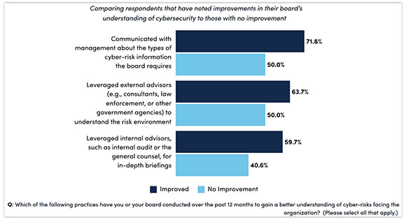 Cybersecurity oversight (n=160)—Nearly 80% of respondents reported that their board’s understanding of cybersecurity today has significantly improved compared to two years ago.
