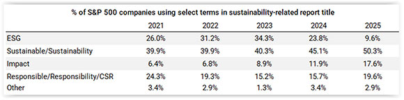 “ESG” nomenclature—Among the S&P 500, sustainability report titles most commonly use the term “sustainable” or “sustainability,” whereas the use of “ESG” in the title has declined from a five-year peak of 34% in 2023 to less than 10% this year.