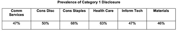 Prevalence by GHG Protocol category & sector—Scope 3 Category 1 (Purchased Goods & Services) is the most prevalent disclosure among companies in six sectors – in most cases, by a wide margin: