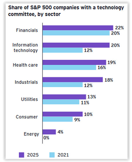 Standalone committee—Up from 7% in 2018, 13% of the S&P 500, most commonly financial services companies, have a board technology committee.